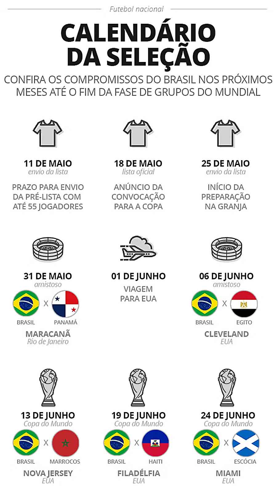 O amistoso será o último compromisso antes da convocação definitiva para o Mundial, momento em que Ancelotti definirá os 26 jogadores que representarão o Brasil na busca pelo hexacampeonato.
